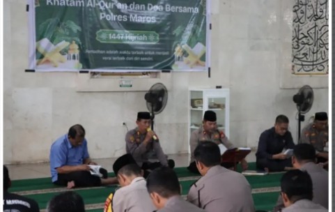 KARYANEWS.id, Maros – Dalam rangka meningkatkan keimanan dan ketakwaan di bulan suci Ramadan, Polres Maros menggelar kegiatan Khatam Al-Qur’an yang diikuti oleh seluruh personel di lingkungan Mapolres Maros. Kegiatan tersebut dilaksanakan di Masjid Agung Maros pada Kamis (5/3/2026) dan berlangsung dengan penuh khidmat.